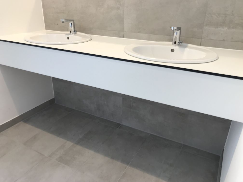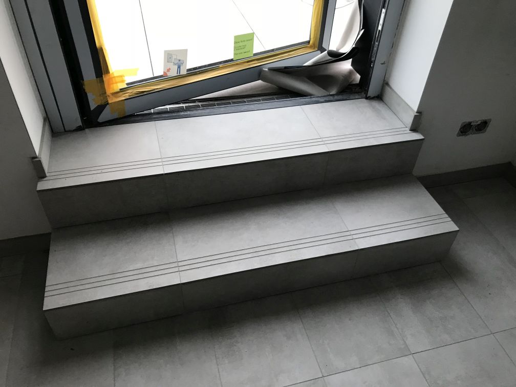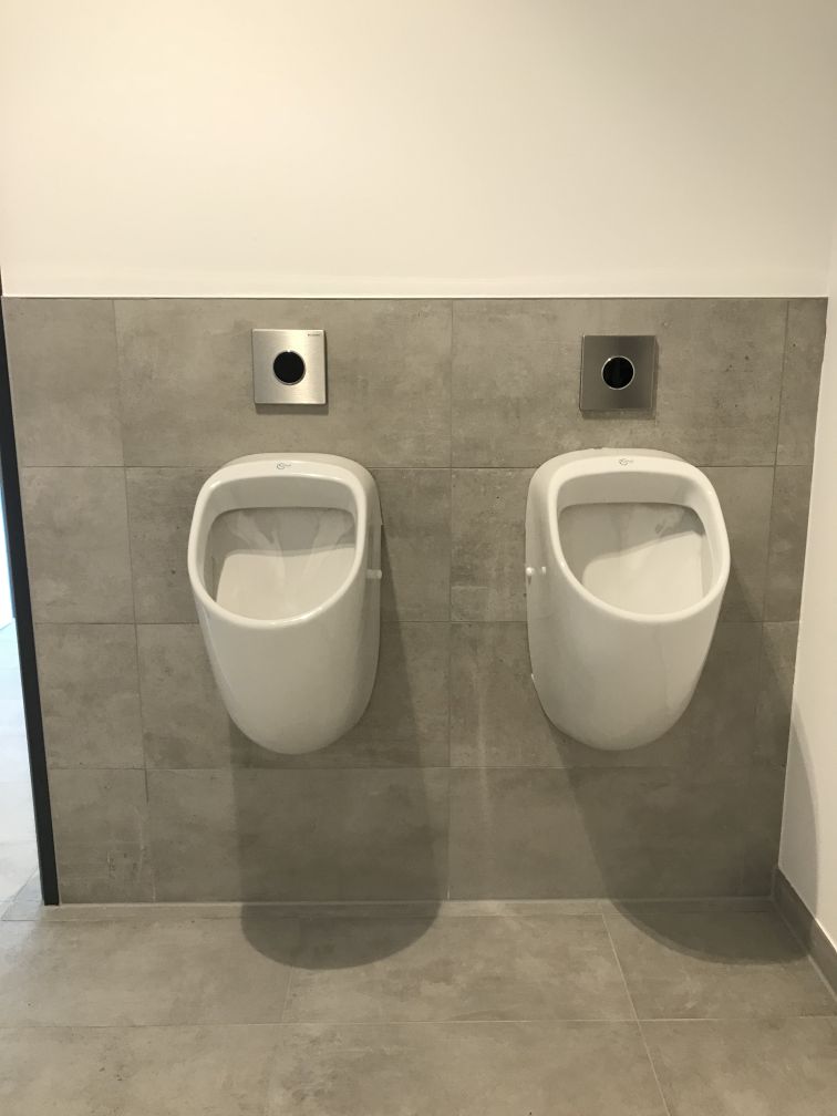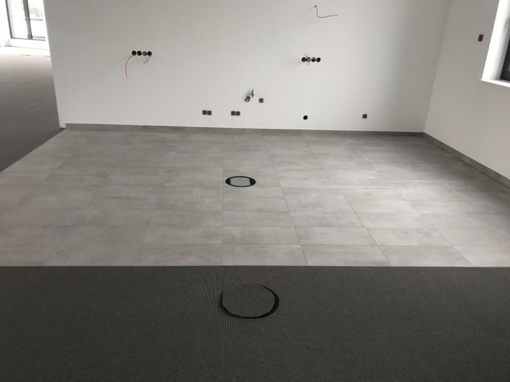 Verfliesung der Sanitärräume (Toiletten, Badezimmer), der Fluren und des Treppenhauses mit Platten in zwei Größen: 30 x 60 cm und 60 x 60 cm.