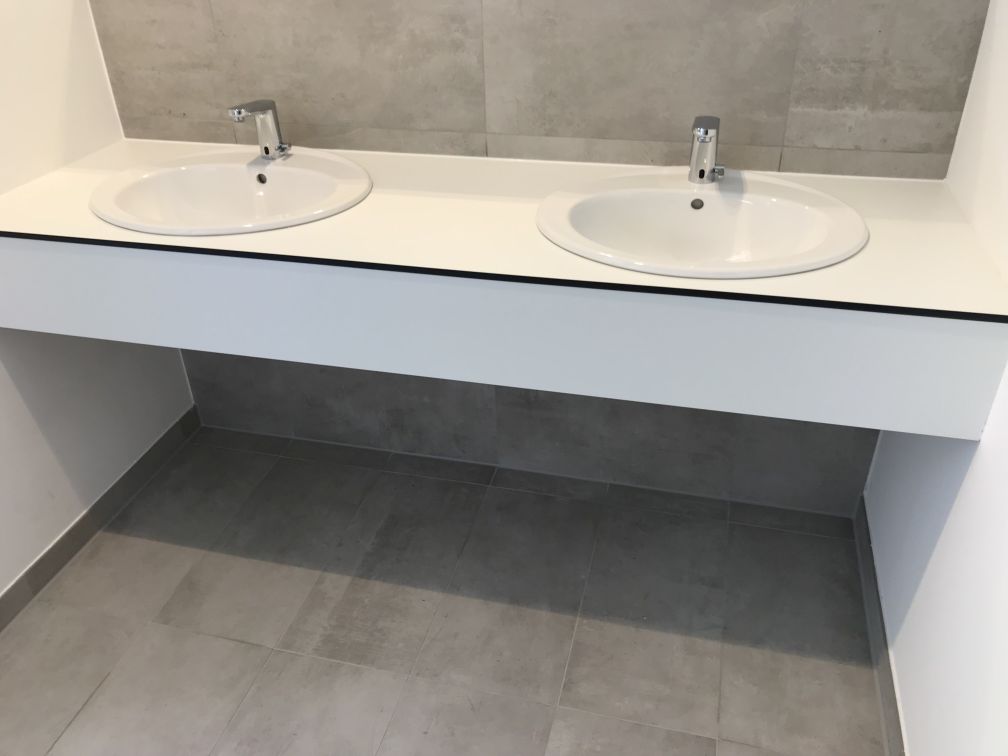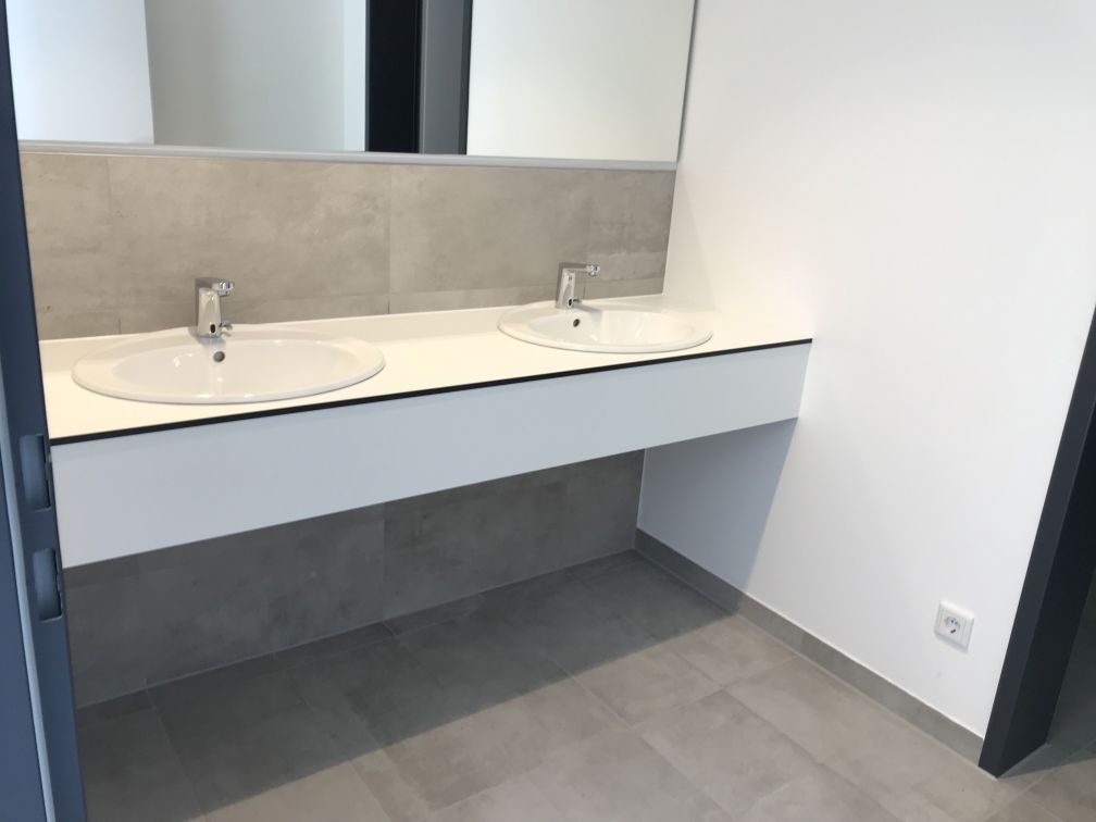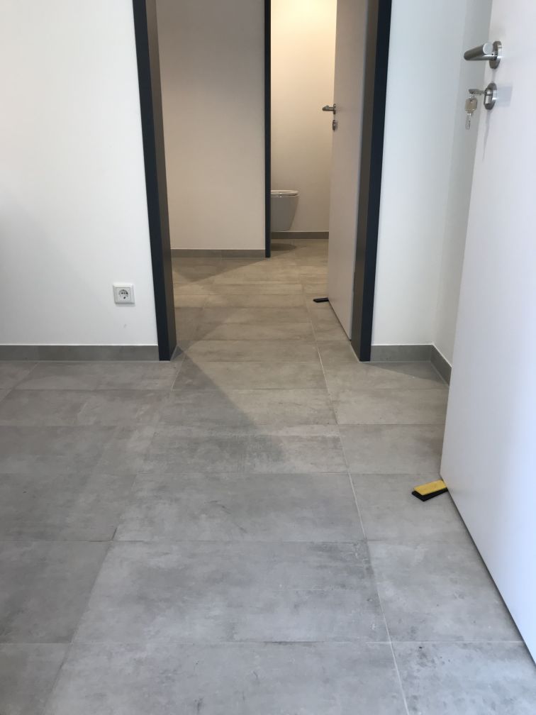 Feladatunk volt ebben az irodaházban a vizes blokk(wc, fürdő), folyosók és a lépcsőház burkolása. Kétféle mérettel dolgoztunk a 30×60 cm és a 60×60 cm lapokkal.