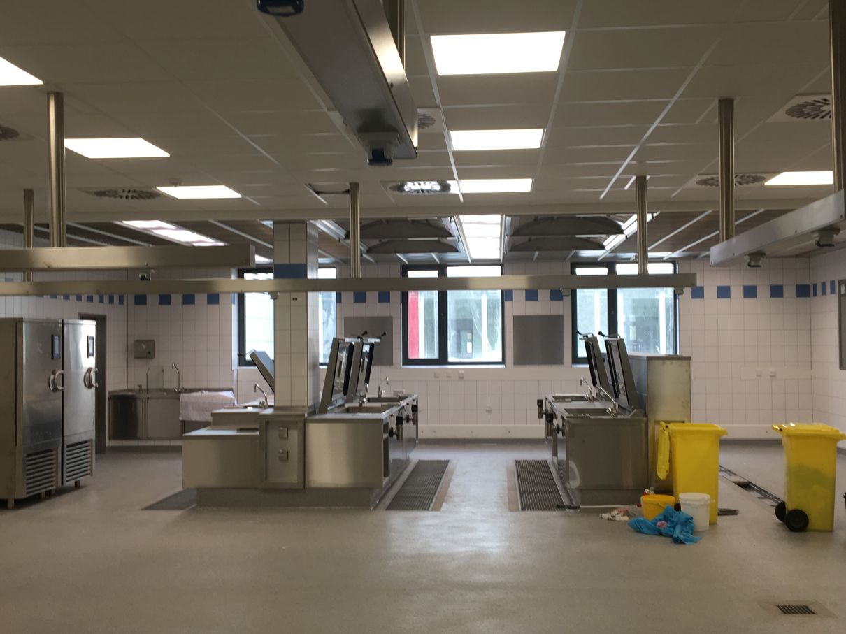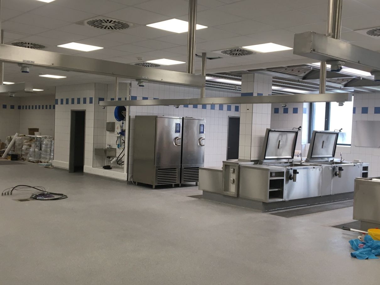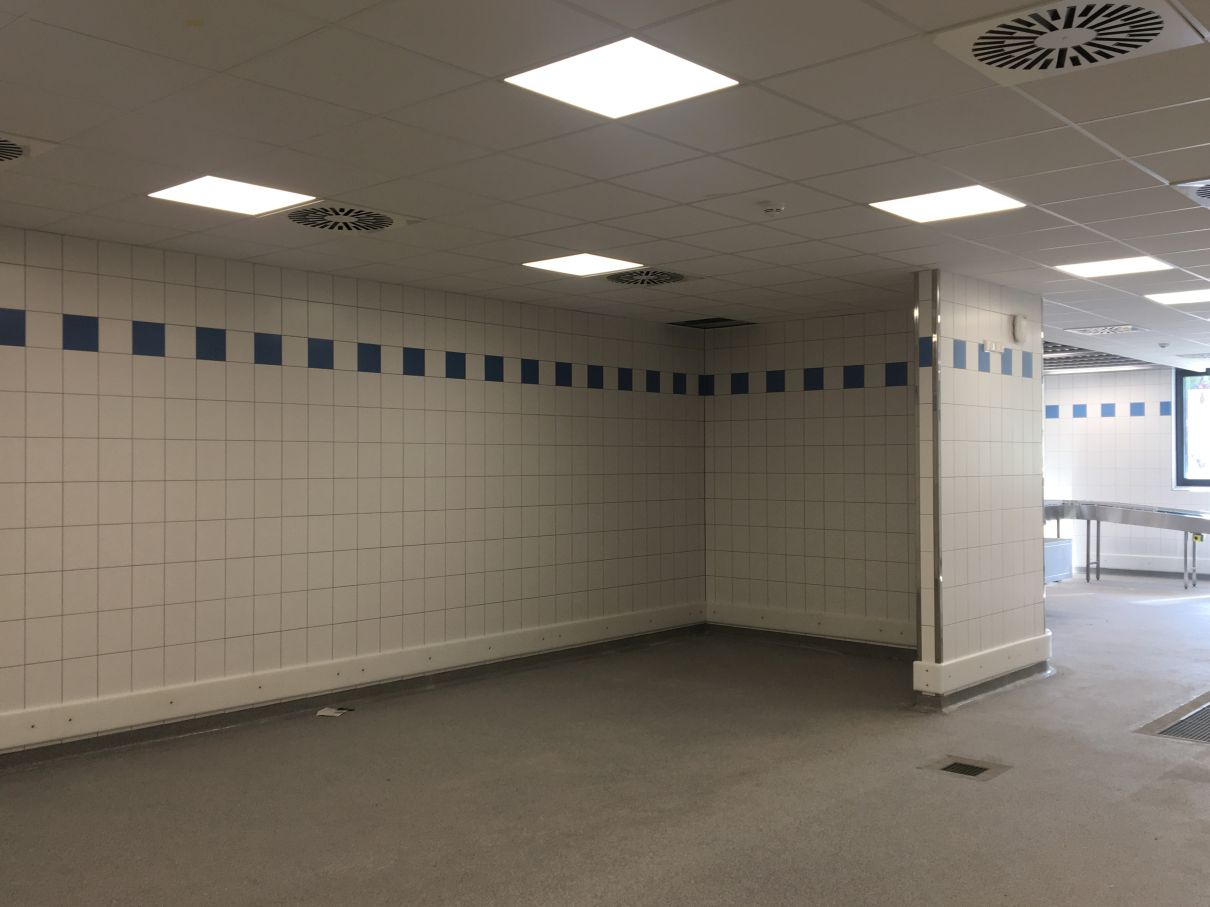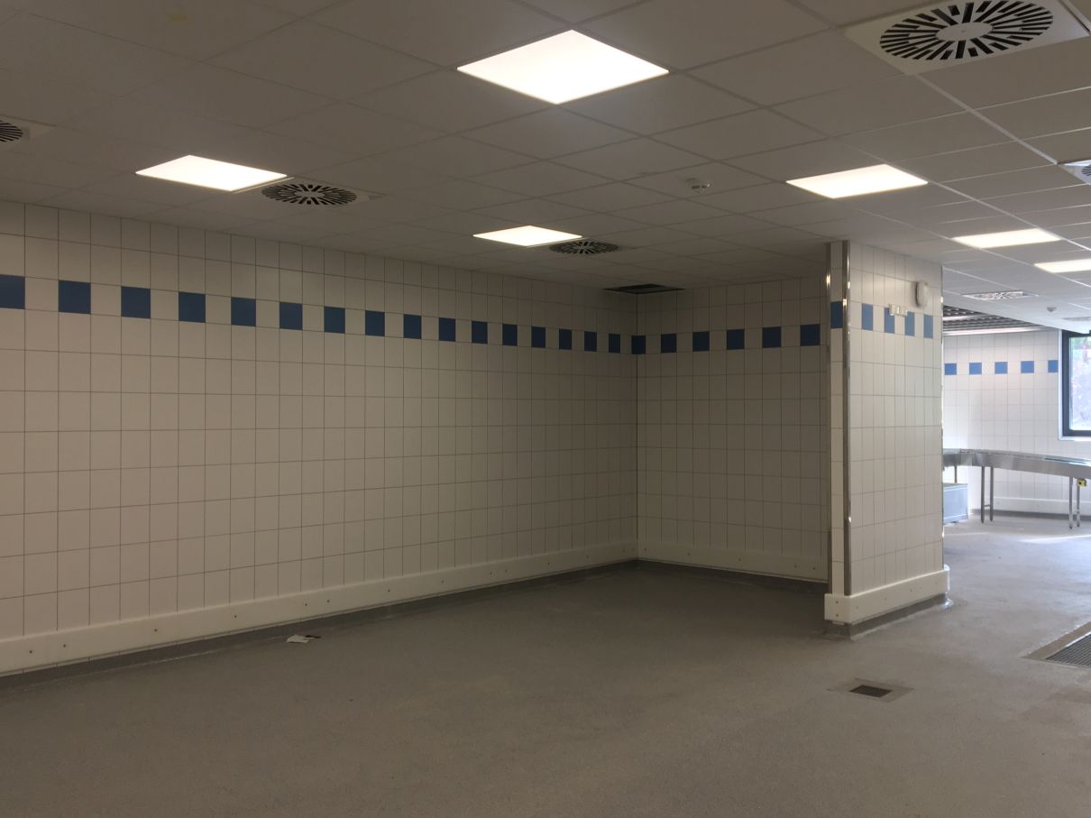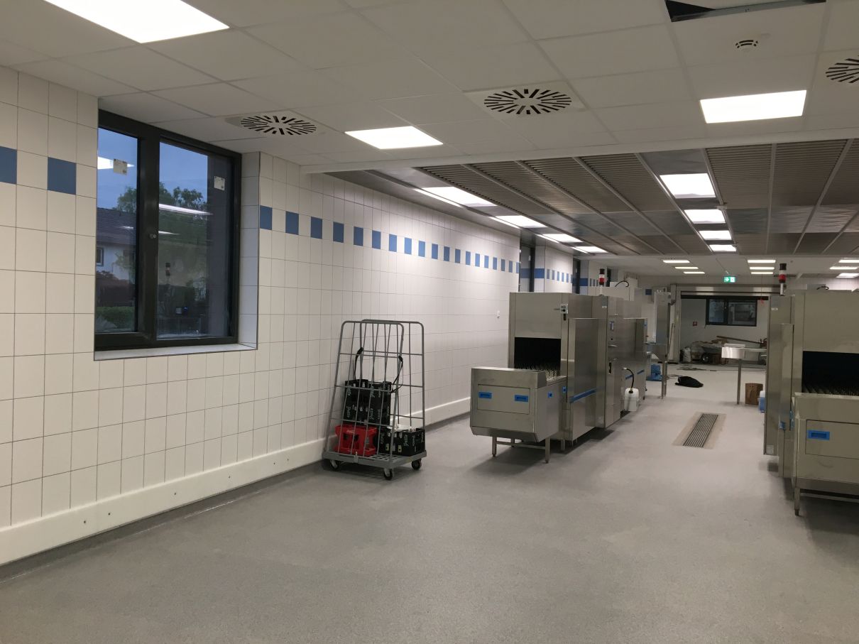 Egy ipari konyha burkolása volt a feladat. Aminek a különlegessége a (klasse c) osztályú/minősítésű víz szigetelés melynek követelménye az epoxid anyaggal történő fugázás.