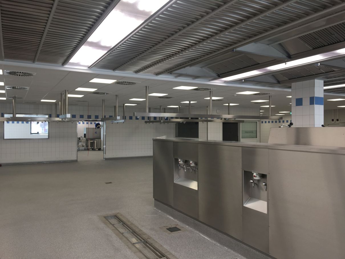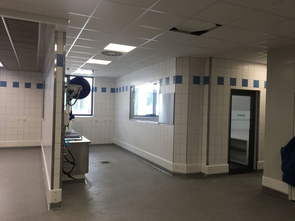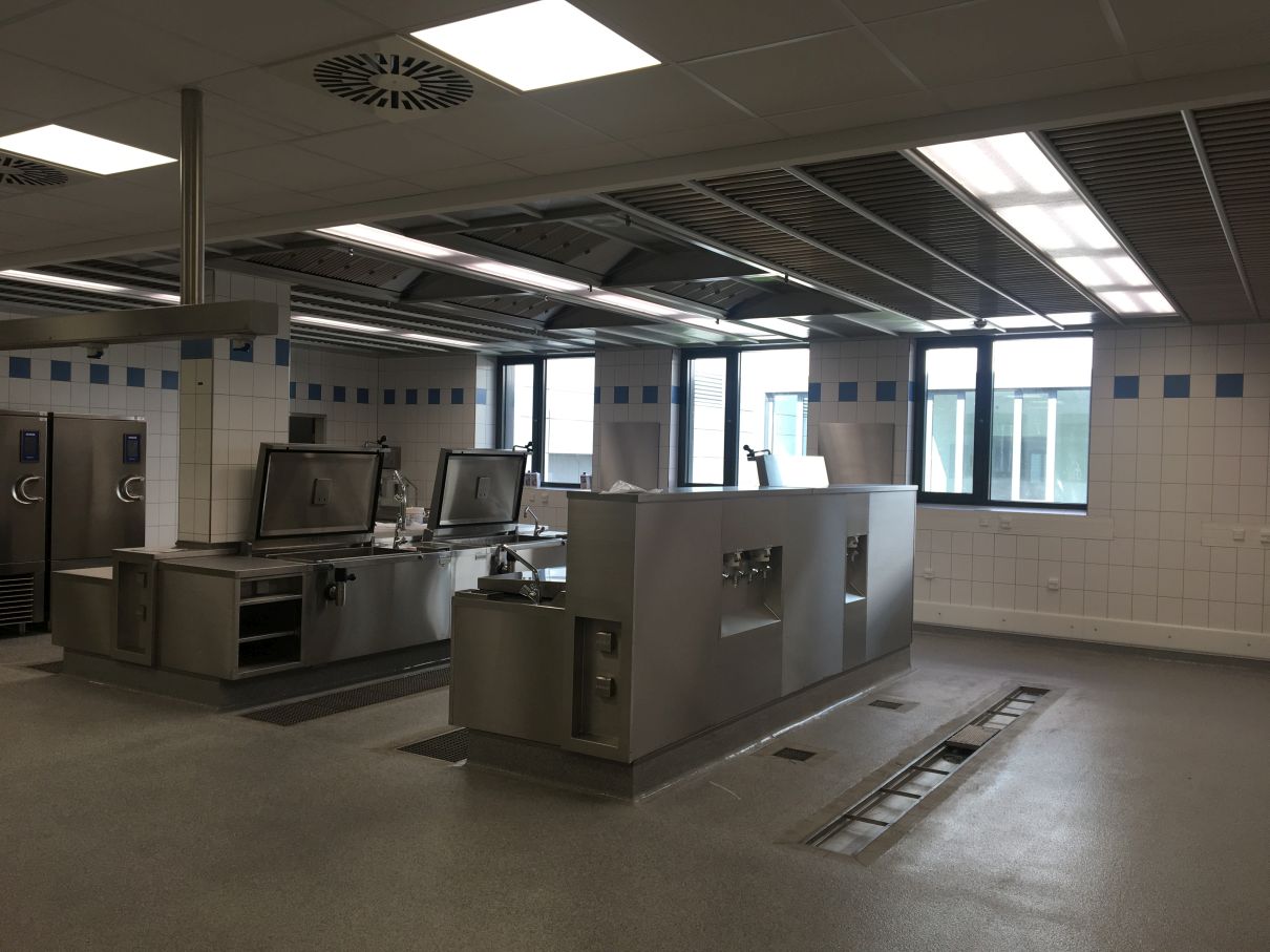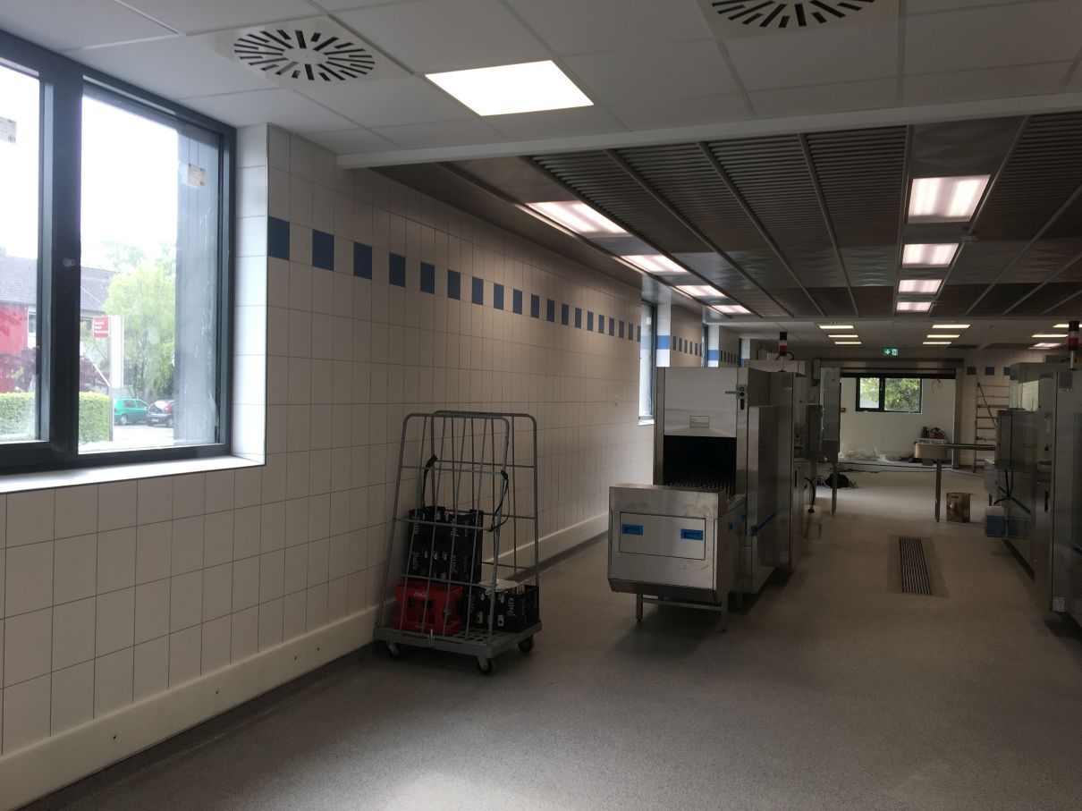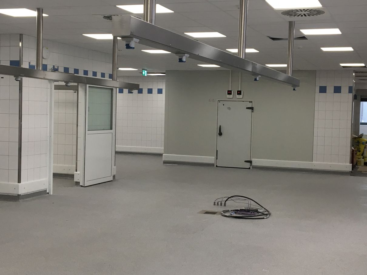 Egy ipari konyha burkolása volt a feladat. Aminek a különlegessége a (klasse c) osztályú/minősítésű víz szigetelés melynek követelménye az epoxid anyaggal történő fugázás.