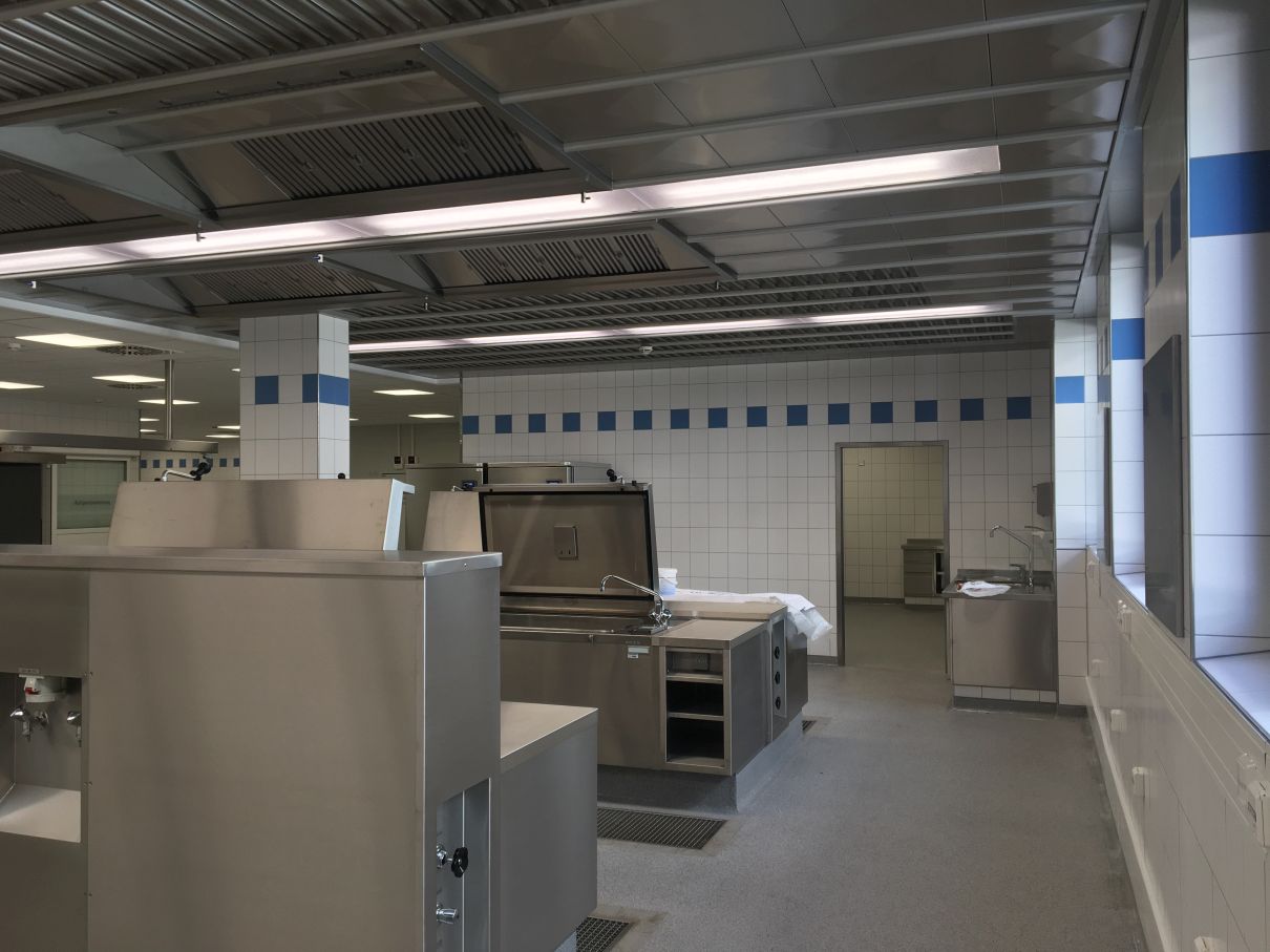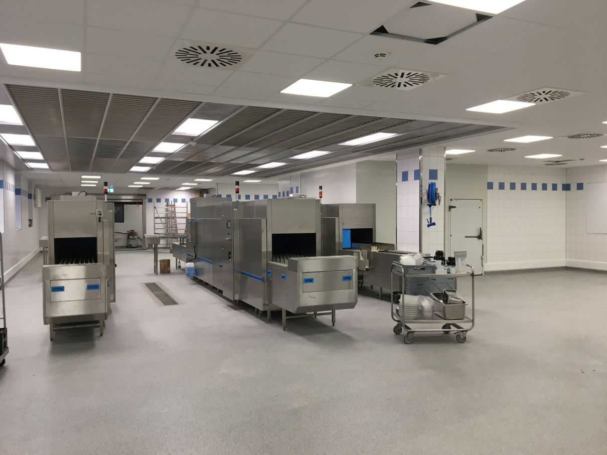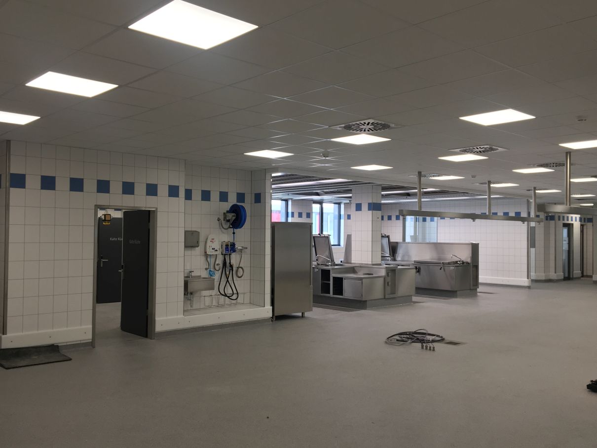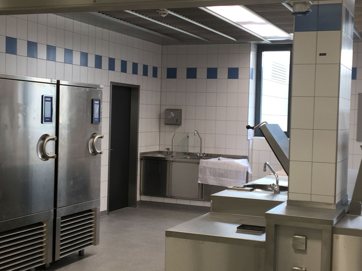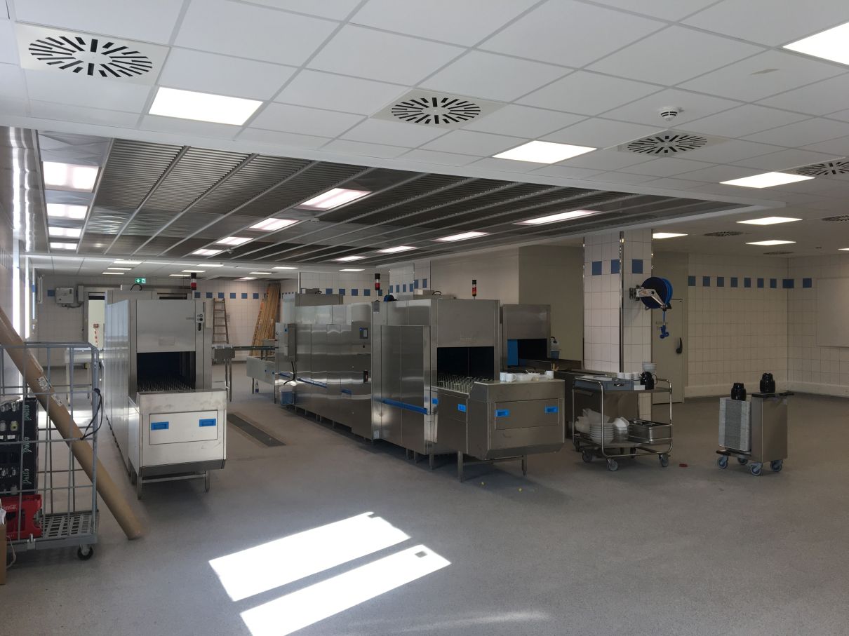 Egy ipari konyha burkolása volt a feladat. Aminek a különlegessége a (klasse c) osztályú/minősítésű víz szigetelés melynek követelménye az epoxid anyaggal történő fugázás.