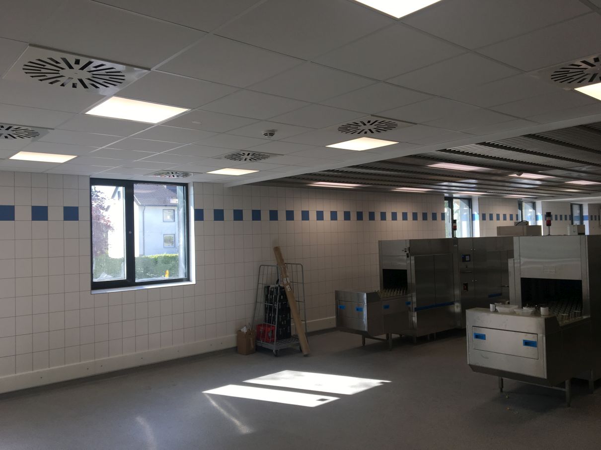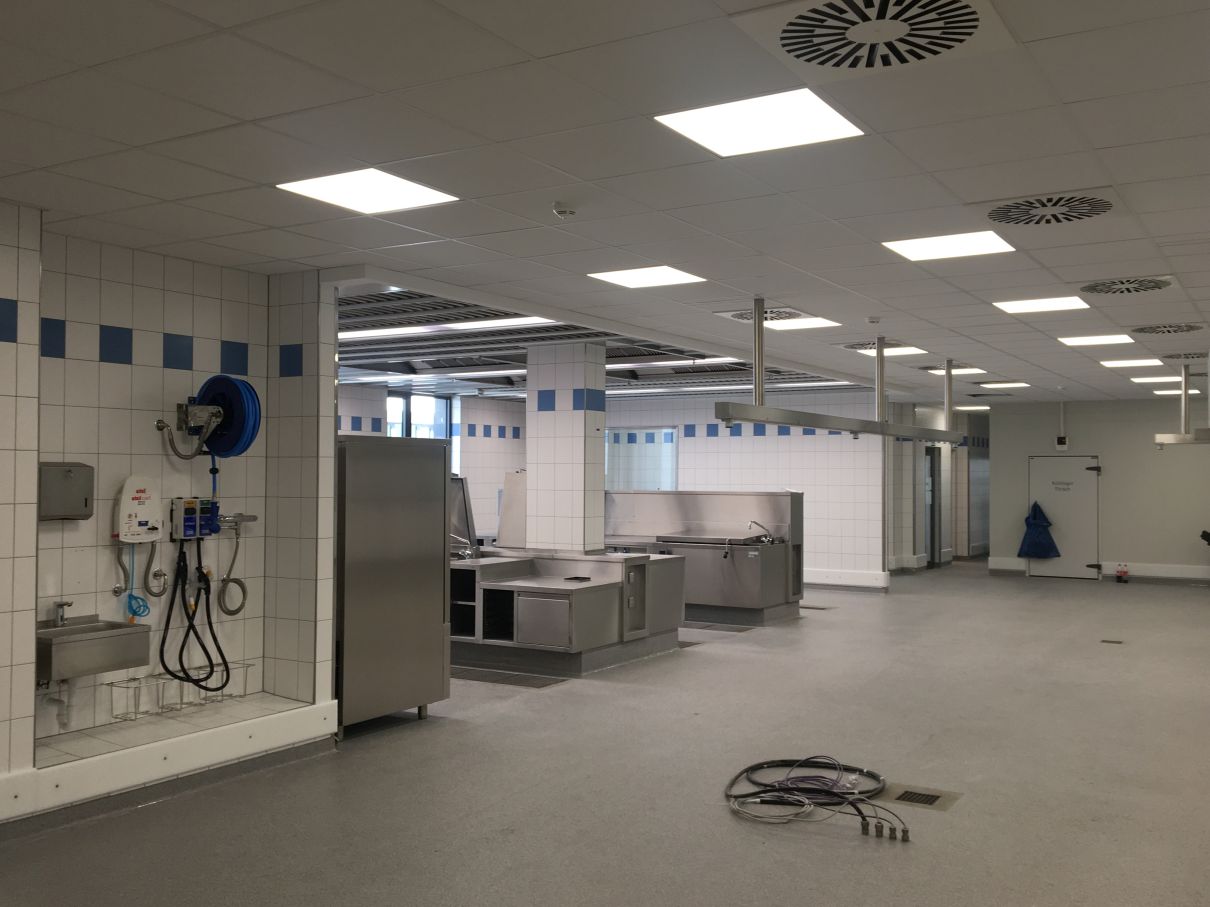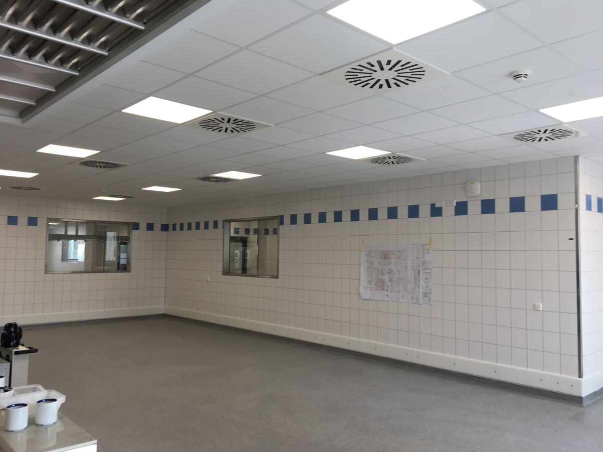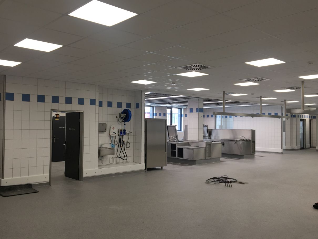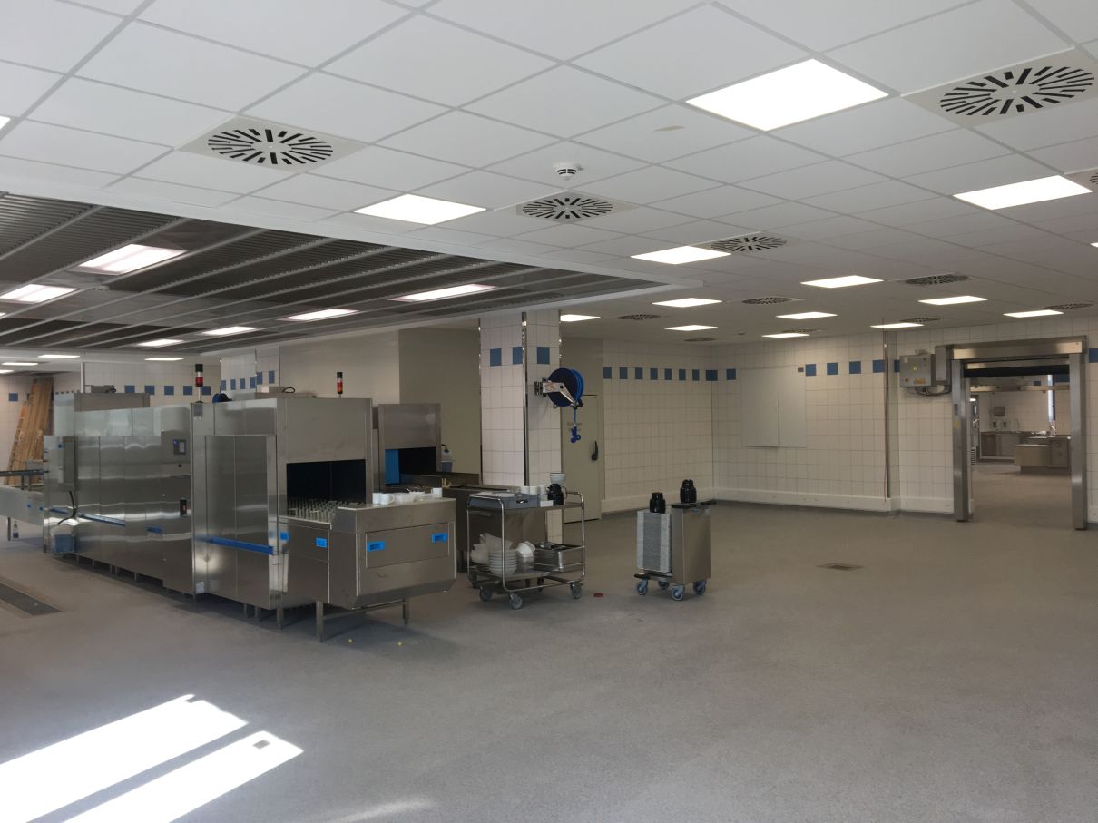 Egy ipari konyha burkolása volt a feladat. Aminek a különlegessége a (klasse c) osztályú/minősítésű víz szigetelés melynek követelménye az epoxid anyaggal történő fugázás.